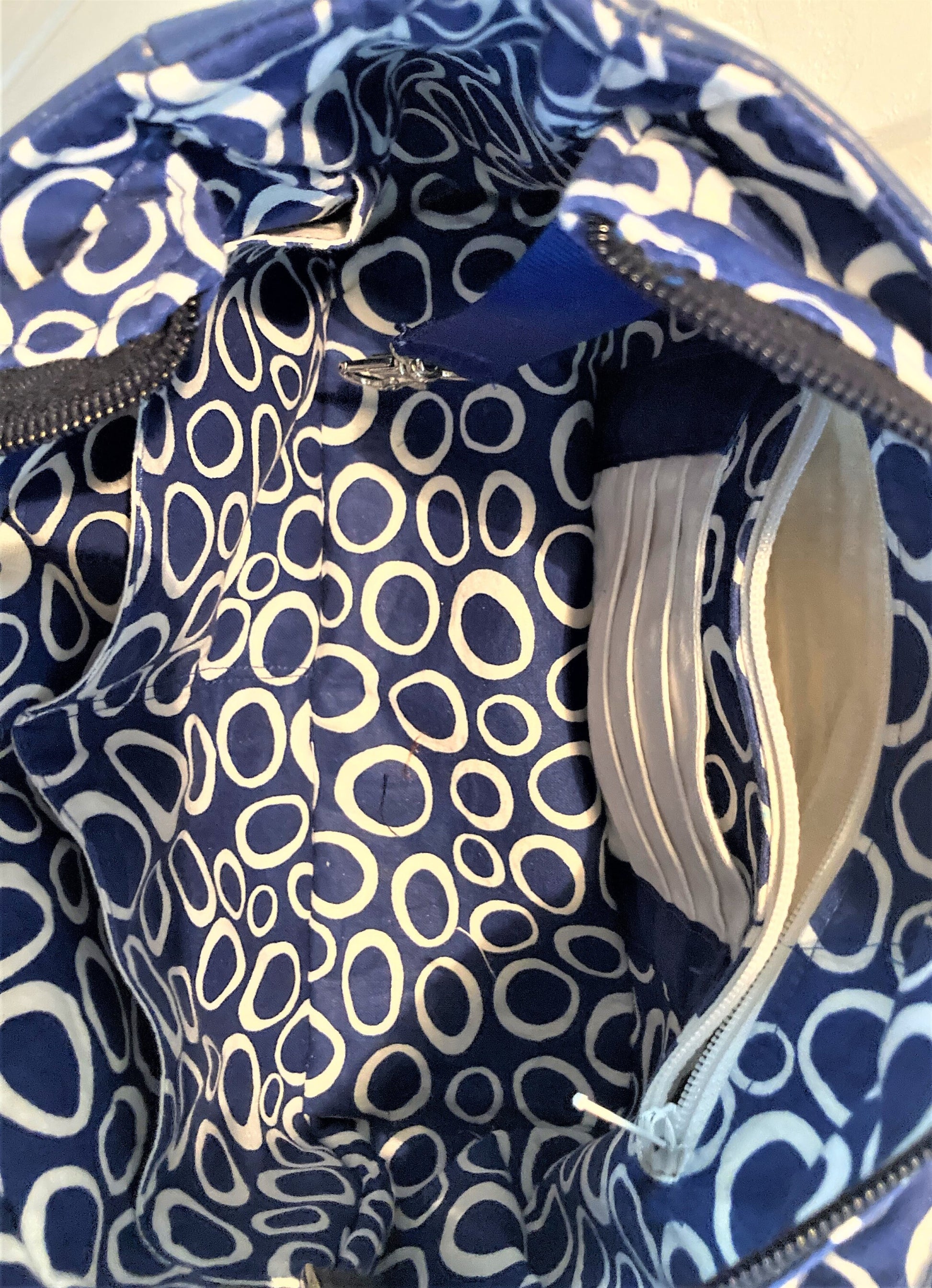 Bag Measurements: 12”-wide, 7”-high, 4”-deep; by the pattern the strap is 38” long but can be adapted to any length you wish. There are 11 pockets plus the main section of the bag, key strap with hook, zipper closure at top and on interior pocket, purse feet on the bottom to help keep it clean.