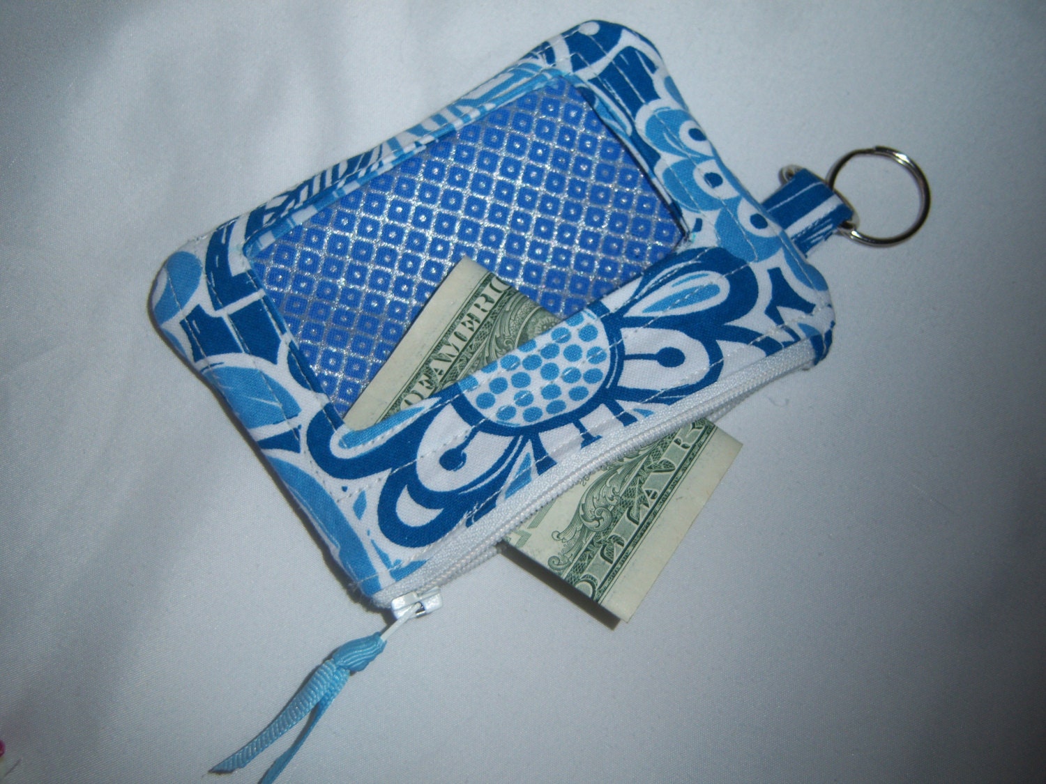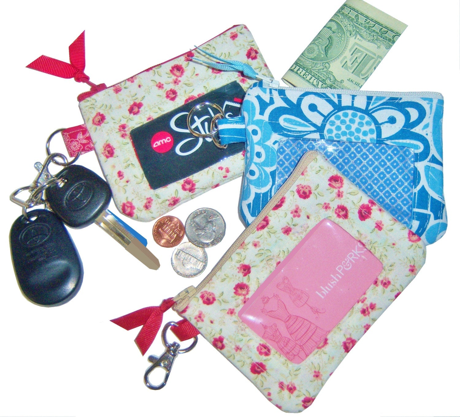This little wallet can be joined to your key chain for the ultimate in convenience. The wallet has a clear window that allows a card or ID to be seen easily, but it is contained within the zippered wallet so you never have to worry about it slipping out and away from you. Inside you have an additional pocket to keep more cards or paper bills tucked in, and a large center section to hold lipstick, coins, medication, any small items you would like to have with you when you head out the door. Everything is protected from loss as the top zips closed. Slip it in your pocket easily! It is even large enough for a small flip phone to fit inside. This all makes it the perfect "essentials" wallet.