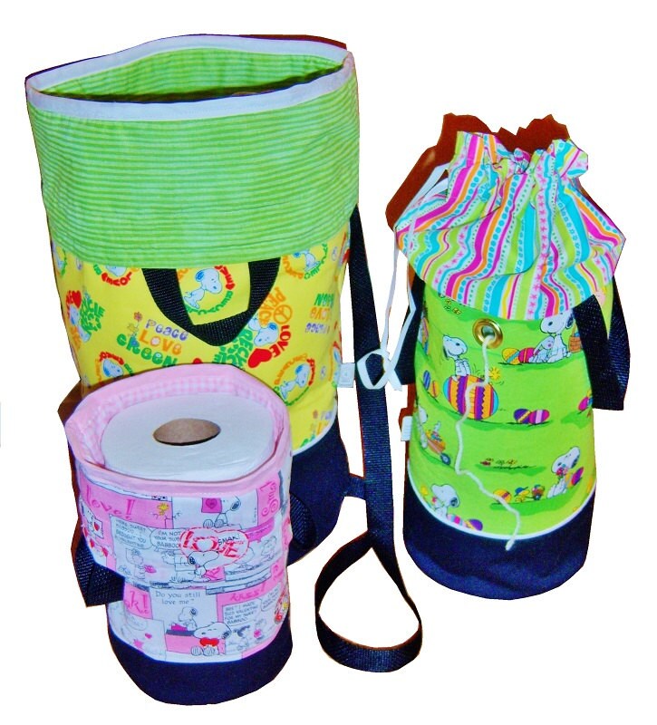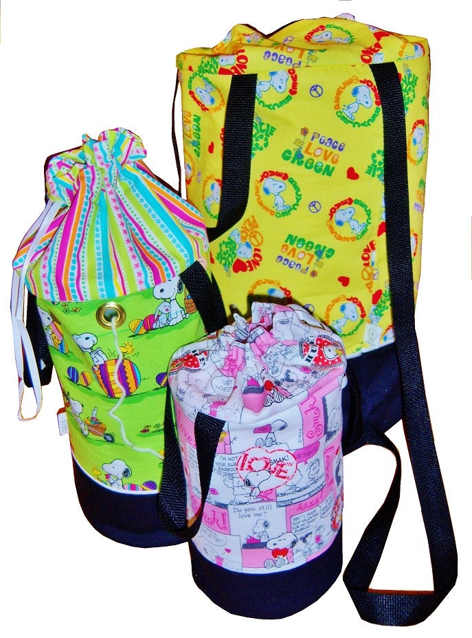 Fabric requirements: Small-3 fat quarters; 1/4 yd. interfacing; Medium-3 fat quarters, 1/3 yd. interfacing; Large-2/3 yd, 1/2 yd of two fabrics, 1/2 yd. interfacing. Other items needed: nylon webbing, grommet, bias tape, twill tape