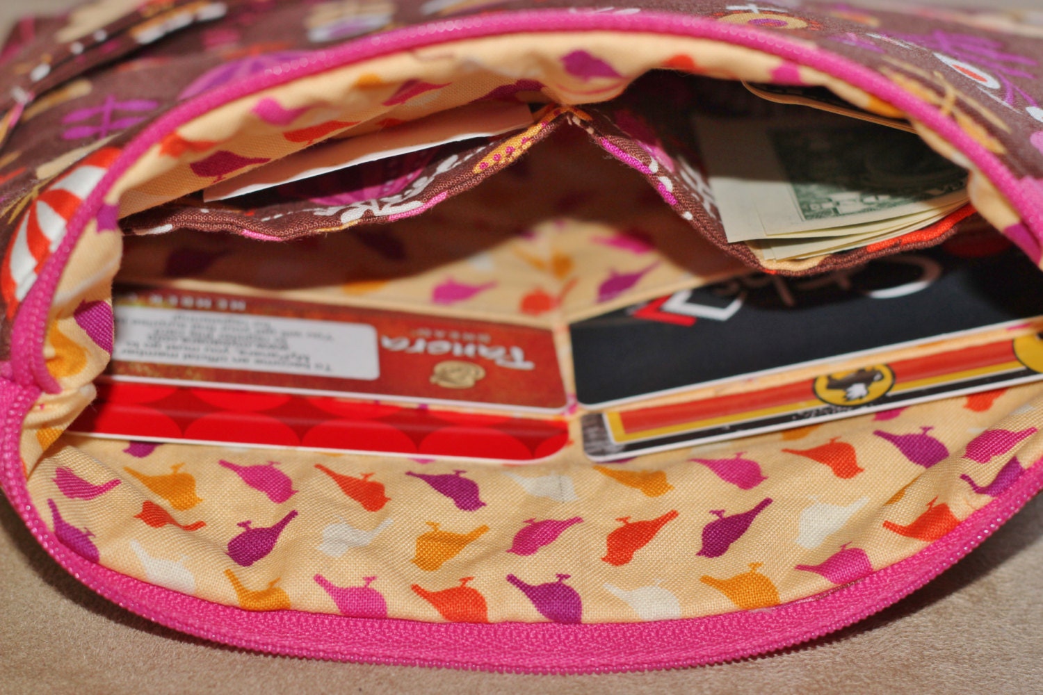 Finished bag measures: 8 3/4" across bottom, 8 3/8" across top, 6 1/4" from top to bottom. Clear pocket measures 4" by 8 1/2" (pocket itself measures 5 1/8" x 8 1/2"). Inside is a padded main compartment along with 4 credit card pockets that can hold more than one card in each pocket and a double pocket on the other side. Handle strap measures 8".