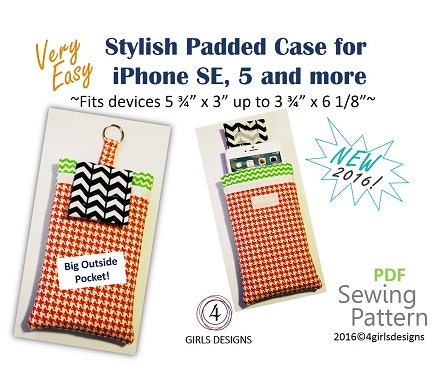 I have designed new sizes for Padded Case Sewing Patterns. This listing is for a sewing pattern that fits the Apple iPhone SE and the 5 as well as more smartphones. This case best fits phones that are at least 5 3/4" x 3" and phones up to 6 1/8" x 3 3/4".