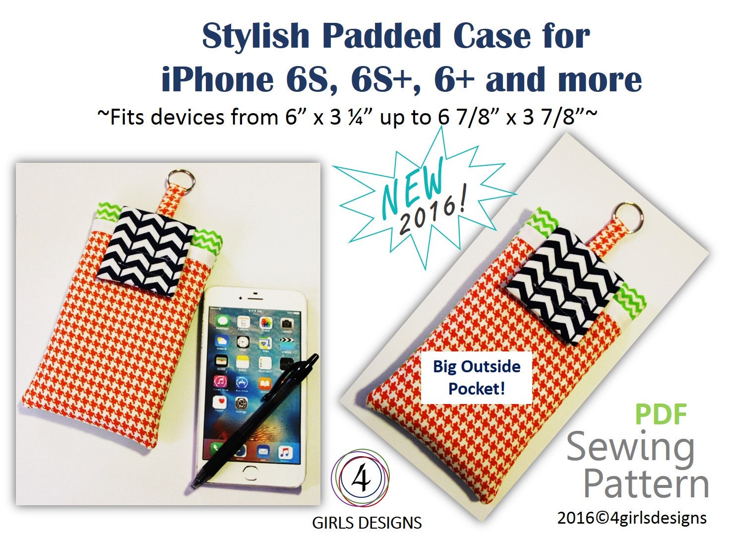 I have designed new sizes for Padded Case Sewing Patterns. This listing is for a sewing pattern that fits the Apple iPhone 6, 6s, 6+ and More larger smartphones. This case best fits phones that are at least 6" x 3" and phones up to 6 7/8" x 3 7/8".
