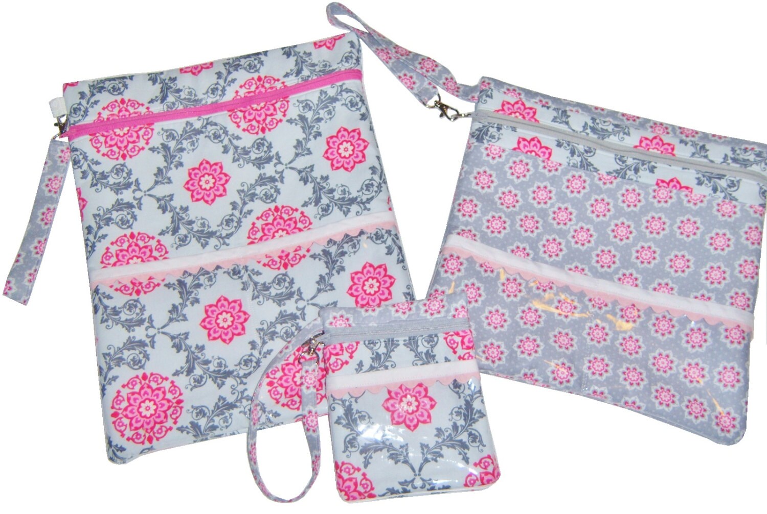•Materials to make all three: Focus fabric: 1 yard, Complimentary fabric 7/8 yard, lining 1 yard, 1 1/8 yard Fusible Fleece Interfacing, 18" x 34 1/2" piece of clear vinyl, 2 pkg. Rick Rack trim, 2 pkg. Double Fold Bias Seam Binding, 1-7" and 2-14" zippers